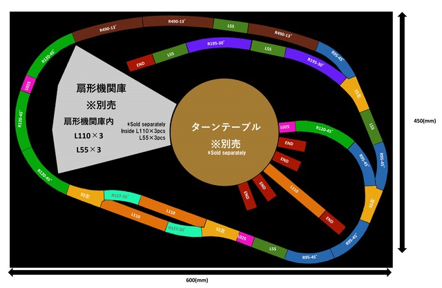 <ご購入前に必ずお読みください> ■注意:こちらのアソートだけではレイアウトは完成しません。別途S037 デジタルターンテーブル及びS038 扇形機関庫、A035 レールブロックが必要です。 ■本アソートは上級者向けです。組立にあたっては、レイアウトのベースをターンテーブルに合わせ円形にくり抜いたり、ポイントレールとの接続部で干渉する道床をカットしたりするなどの加工が必要になります。 ■ターンテーブルと機関庫のあるレイアウトをできるだけ小さく作りたい方向けのアソート。最小走行半径R95以下の車両が走行可能です。 ■サイズは幅約600mm×奥行約450mm(組み立てたレール部分のみの寸法です。実際には一回り大きいボード上に設置することをおすすめします)。 ■単品で揃えるよりお得な価格設定となっています。 ■アウトレット品であり、ノークレーム・ノーリターン商品になります。あらかじめご了承ください。 ■セット内容:R001×2パック、R010×2パック、R011×1パック、R012×2パック、R013×3パック、R019×1パック、R022×4パック、R024×4パック、R030×1パック、R032×1パック ■コントローラー、ポイント切り替えスイッチ、各種ケーブル類、車両などは別売です。 ■おすすめの車両:C11各種(T019)、DE10各種(T012)、ワム70000各種(T024)、トラ45000各種(T025) <Please read before purchasing.> ■ Note: This assortment alone is not sufficient to complete a layout. You will also need the S037 Digital Turntable, S038 Round House, and A035 Turntable Rail Block. ■ This assortment is intended for advanced users. During assembly, modifications will be necessary, such as cutting out a circular section in the layout base to fit the turntable or trimming the track bed where it interferes with the switch points. ■ This assortment is designed for those who want to build a layout featuring a turntable and round house as compactly as possible. It is compatible with vehicles capable of running on a minimum curve radius of R95 or less. ■ Dimensions: approx. 600 mm wide × 450 mm deep (These dimensions apply only to the assembled track section. we recommend installing this on a board that is slightly larger). ■ It is priced more favourably than purchasing the items individually. ■ Please note that these are outlet items and are sold on a ‘no returns, no refunds’ basis. ■Set contents: R001 × 2 packs, R010 × 2 packs, R011 × 1 pack, R012 × 2 packs, R013 × 3 packs, R019 × 1 pack, R022 × 4 packs, R024 × 4 packs, R030 × 1 pack, R032 × 1 pack ■Controllers, Turnout switches, Various types of cables and trains are sold separately. ■Recommended cars: C11(T019),DE10(T012),WAMU 70000(T024),TORA 45000(T025) Made in China