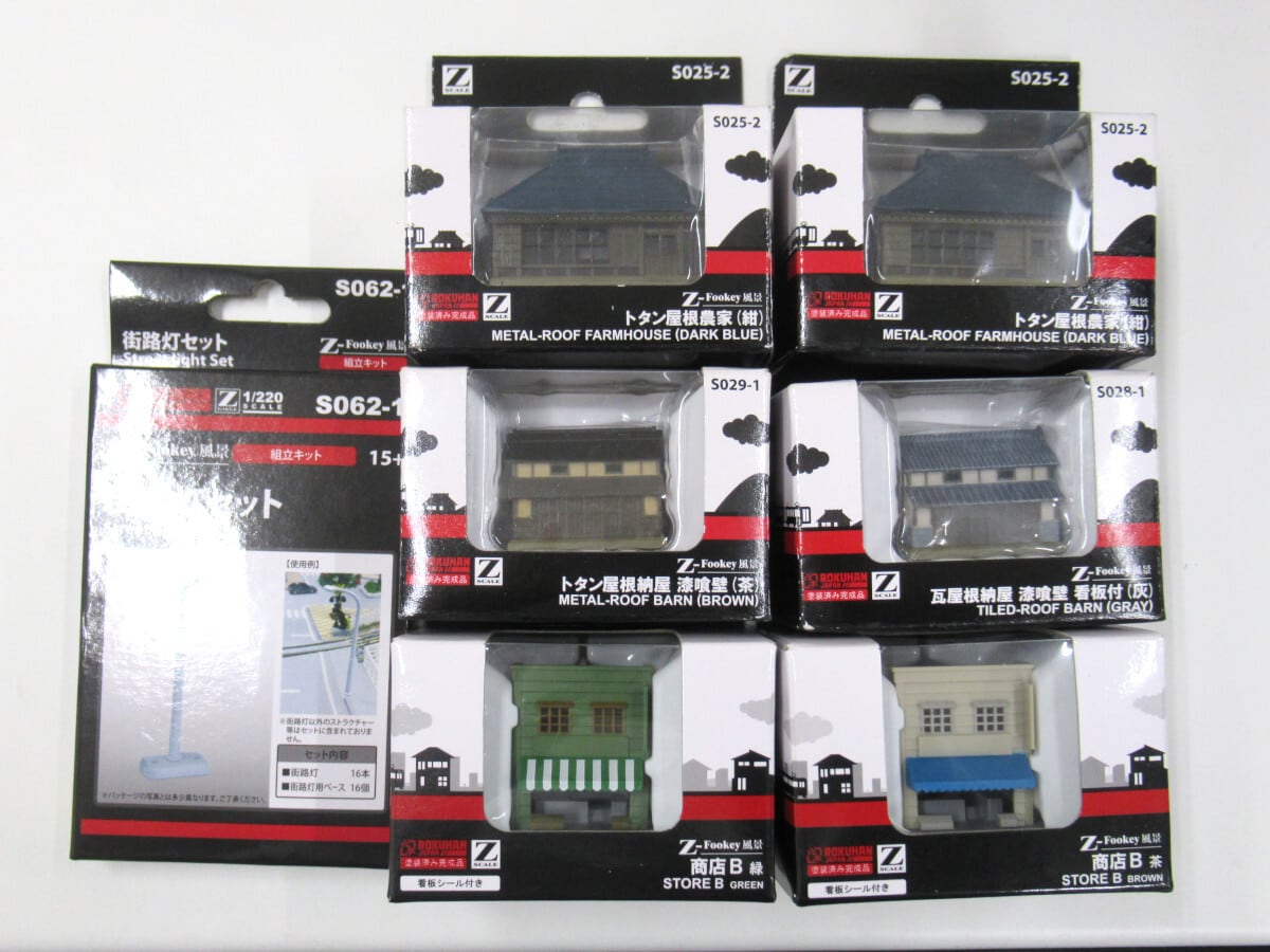 ■セット内容:トタン屋根農家(紺)×2、瓦屋根納屋 漆喰壁 看板付(灰)×1、トタン屋根納屋 漆喰壁(茶)×1、商店B(茶)×1、商店B(緑)×1、街路灯セット×1